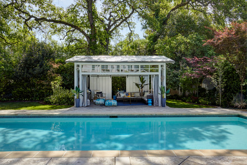 Adding cushions and pillows to your relaxation experience provides that soft goods factor you desire when you’re outdoors. A patio with printed curtains and blue bright pillows really makes an outdoor space cozy. Although they get wet, outdoor rugs usually dry out fast, and they feel great to walk on.