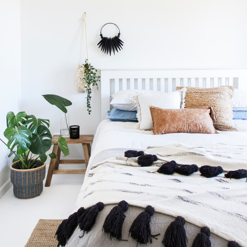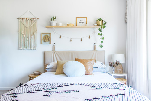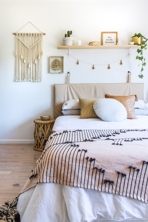 Bringing a touch of nature indoors is a hallmark of Bohemian design. In a Coastal Boho bedroom, introduce indoor plants and greenery to enhance the connection to the outdoors. Choose low-maintenance plants such as succulents, snake plants, or a fiddle leaf fig tree. Place them in woven baskets or decorative pots to add an extra layer of texture and visual interest to your space. The lush greenery complements the coastal color palette and adds life to the room.