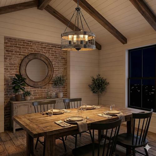 - Design — This coastal rustic chandelier is inspired by modern farmhouse style and barn design. The appearance of Nature Wood Texture and black iron fence makes farmhouse dining room light not only lighting, but also a work of art in your home, will add a rustic aesthetic ambiance to your space.