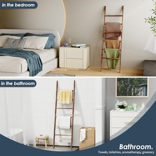 6-Tier Blanket Ladder Wooden, 5.7FT(66.5'') Blanket Quilt Towel Holder Rack Decorative Ladder, Easy Assembly, Rustic Farmhouse Ladder Shelf for The Living Room Bedroom Bathroom Home Decor, Brown
