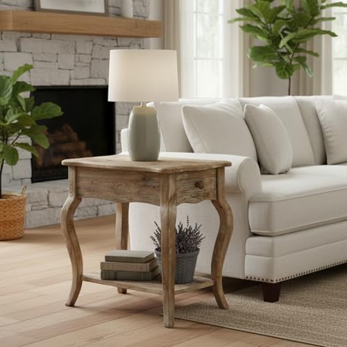 Alaterre Furniture Austerity Living Room Tables – 15 Inch Narrow Chairside Table with Drawer, Shelf, Scalloped Edges, & Curved Legs – Rustic Accent Side Table in Driftwood Finish
