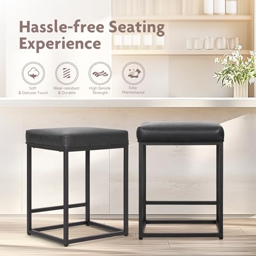 ALPHA HOME Backless Bar Stool, Black, 24 inch, 1PC, Faux Leather, Steel Frame, 3.54" High Density Sponge Foam Cushion, 3cm Thickness, 350 lbs Weight Capacity