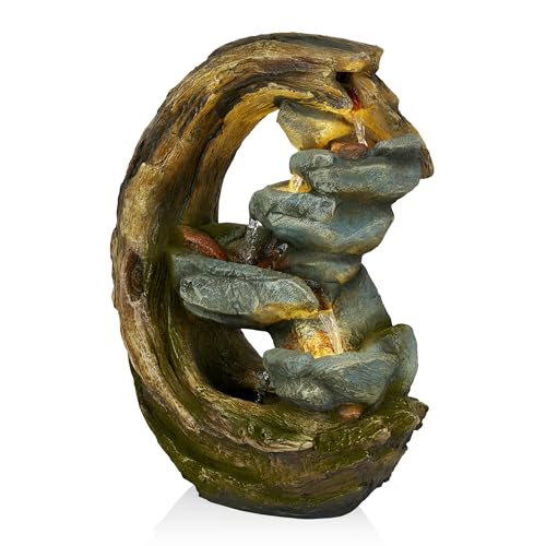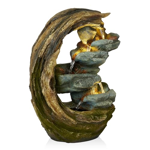 Alpine Corporation WIN1554S Outdoor Curved Trunk and Stone Floor Fountain with Warm White LED Lights, Tiered Garden Decor, 24" H, Brown