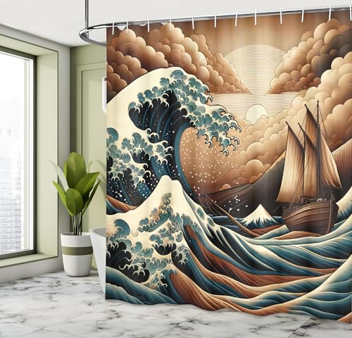 Ambesonne Nautical Shower Curtain, Ethnic Japanese Art Inspired Ocean Waves and Sailboat in Sepia View, Cloth Fabric Bathroom Decor Set with Hooks, 69" W x 70" L, Cinnamon and Petrol Blue