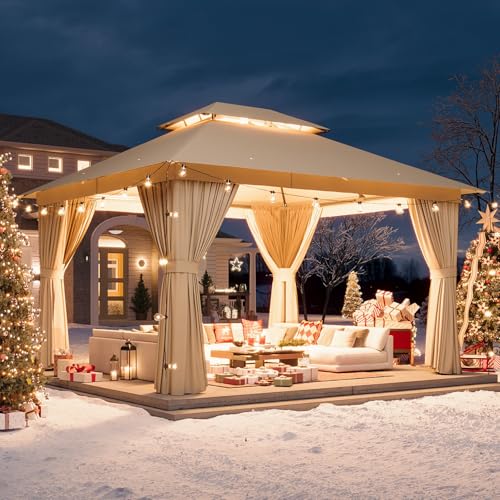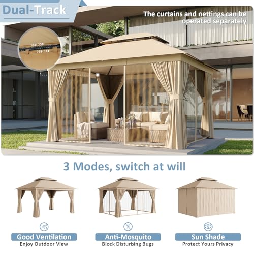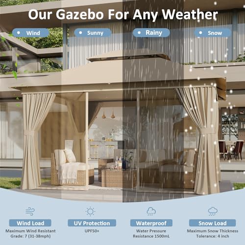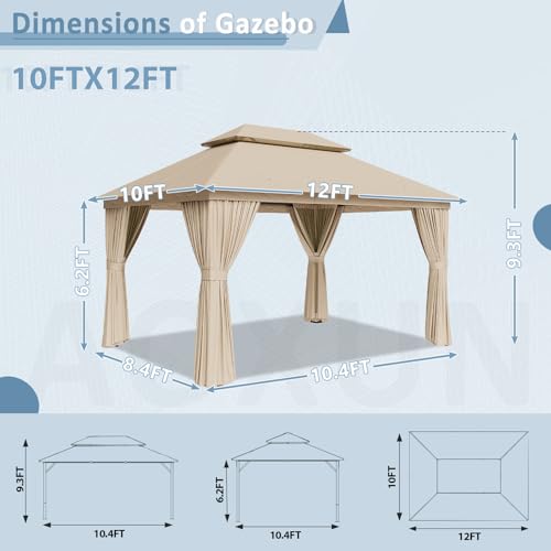 Aoxun 10'x12' Outdoor Patio Gazebo, Heavy Duty Party Tent with Wind-Resistant Ropes, Metal Frame Canopy with Mosquito Nettings and Privacy Screens for Backyard, Deck,Garden, Lawn, (Beige)