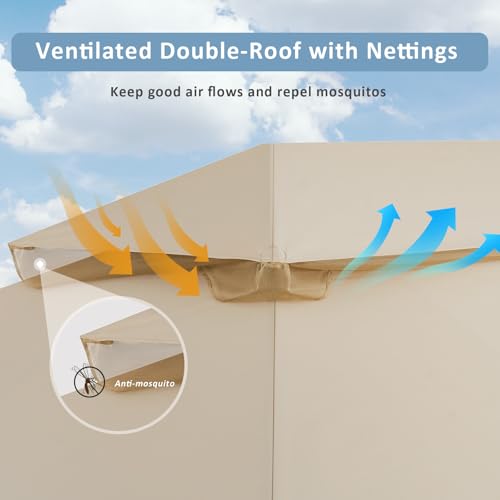 - 【Ventilated Double Roof】Peaked vented roof design enhances airflow while blocking 99.99% UV rays (UPF 50+). Mosquito-proof mesh netting and waterproof curtains offer all-season protection, keeping spaces cool in summer and private in winter. Perfect for family gatherings, garden parties, or outdoor relaxation