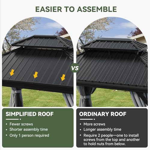 - Especially Easy Assembly: Our roof panel installation design allows for easy setup by just one person, who can secure the screws from the top. In contrast, other gazebos require two people—one to install screws from the top and another to hold nuts from below. Additionally, fewer screws are required for our gazebo assembly, simplifying the process.