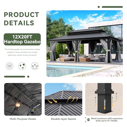 Aoxun 12' X 20' Hardtop Gazebo, Aluminum Outdoor Gazebo with Galvanized Steel Double Roof Canopy, Permanent Metal Pavilion with Privacy Curtain and Netting, for Poolside, Backyard, Square Foundation