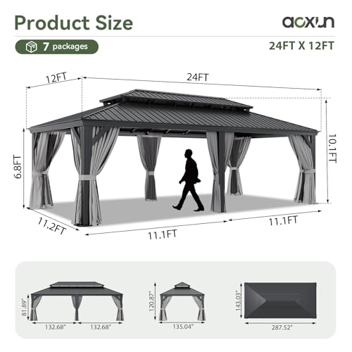 Aoxun 12' X 24' Hardtop Gazebo with Drainage System, Aluminum Outdoor Gazebo with Galvanized Steel Double Roof, Patio Permanent Metal Pavilion with Netting, for Garden, Deck, Grey