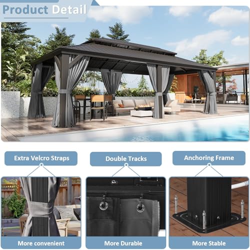 Aoxun 12' x 24' Permanent Hardtop Gazebo with Galvanized Steel Double Roof and Aluminum Frames Outdoor Large Pavilion Gazebo for Patio Deck Garden, Nettings and Curtains Included, Gray