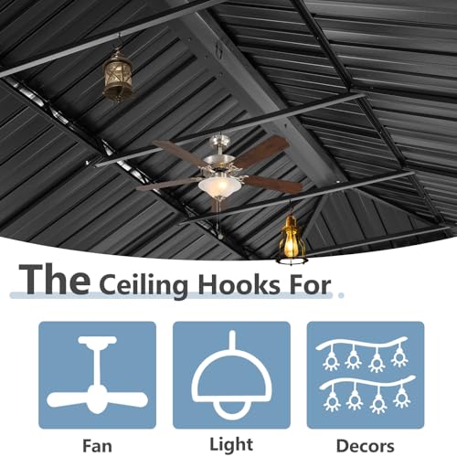 - 【Double Roof】Designed with a double-layer top, this gazebo promotes excellent airflow while shielding against harmful UV rays. Moreover, the sloped roof facilitates rainwater drainage, eliminating concerns about water pooling. Hooks for fans and lights are included, with top hooks supporting up to 44lbs and mid-parietal hooks holding up to 22lbs. This product accommodates up to 12 individuals, each not exceeding 80 kilograms.