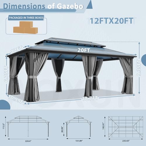 Aoxun 12'x20' Hardtop Gazebo, Aluminum Frame Permanent Pavilion with Curtains and Netting, Outdoor Polycarbonate Double Roof Canopy, Designed for Patio, Garden, Lawns, Gray