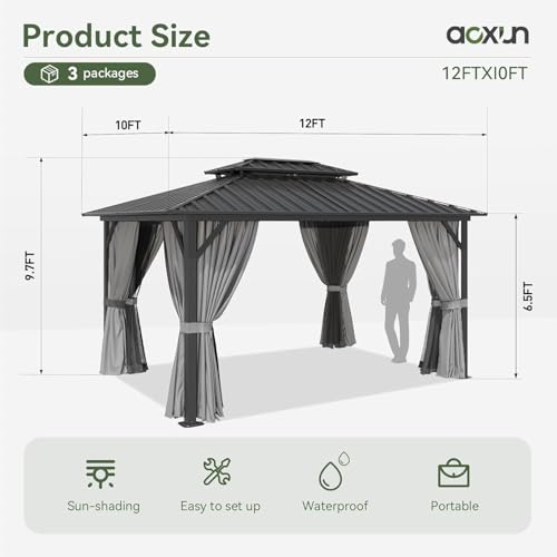 Aoxun Hardtop Gazebo 10×12, Aluminum Frame Canopy with Double Galvanized Steel Roof, Outdoor Gazebo with Breathable Netting and Privacy Curtain for Backyard