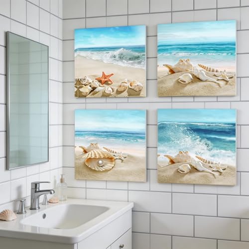 Sandy Beach Shells Starfish Canvas Prints Bathroom Wall Art Picture Painting- Modern Wall Artwork Framed for Home Office Decor-12 x12 x4pcs