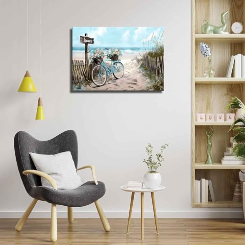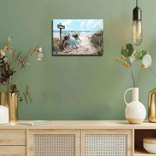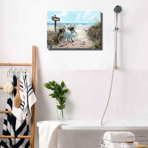 - Coastal Themed:This serene beach canvas art captures a beach bicycle carrying flowers in abstract, wood toned fence on a beach, crystal clear water, – all in cool shades of blue and warm natural hues.These beach impressions will make a statement on your bathroom walls