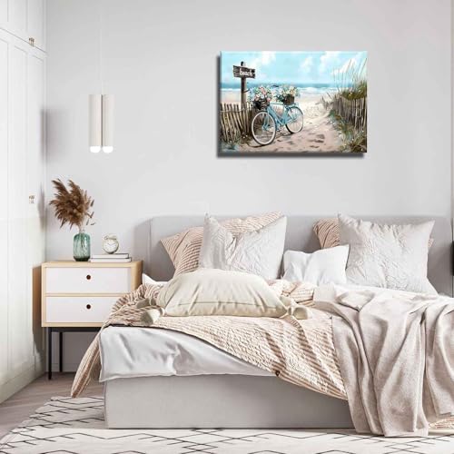 Beach Ocean Canvas Wall Art Seaside Bicycle Seascape Wall Decor Pictures Teal Aqua Blue Calming Shoreside Posters Prints for Modern Coastal Themed Home Decoration Bathroom Room Decoration