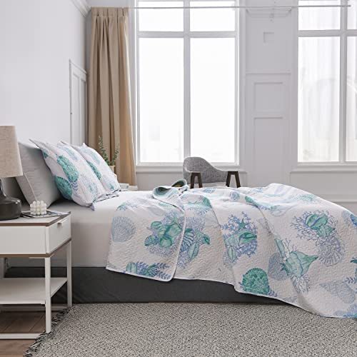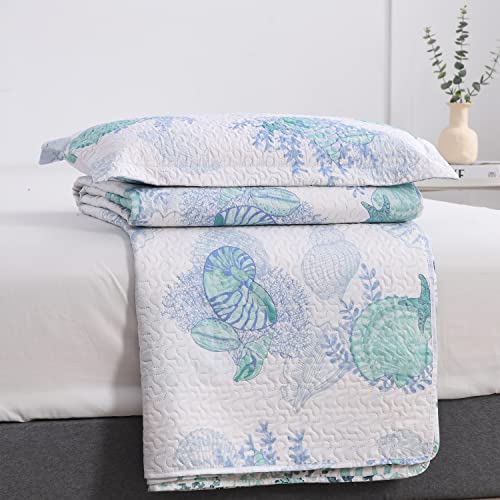 Jarson Beach Quilt Set King Size, 3Pcs Lightweight Summer Seashell Bedspreads Reversible Ocean Bedding with 2 Pillow Shams, Green White