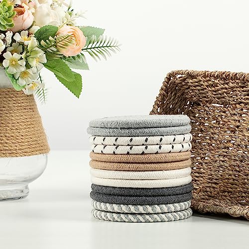 12 Pcs Handmade Woven Coasters for Drinks, Absorbent and Insulating Cotton Coasters with Seagrass Basket Holder set, Boho Perfect for Coffee Table and Home Decor