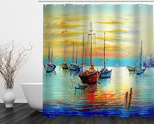 - BROSHAN Nautical Shower Curtain for Mens, Abstract Oil Painting Pirate Ships Sailboat on Sea Ocean Bath Bathroom Curtains, Marine Bathroom Decor Set with Hooks