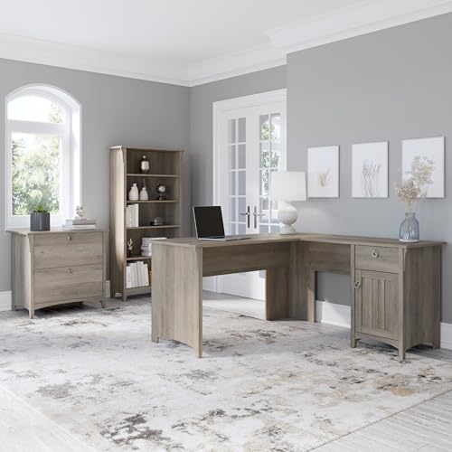 Bush Furniture Salinas L Shaped Desk with File Cabinet and 5-Shelf Bookcase | 3 Piece Living Room Furniture Set in Driftwood Gray | Storage Cabinet, Bookshelf & Office Desk