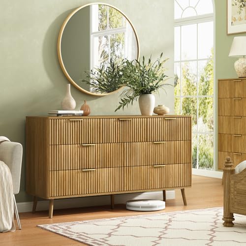- Modern Fluted Dresser for Bedroom: Elevate your space with this modern dresser, featuring elegant fluted panels and a curved profile design. The natural oak dresser with gold handles adds a touch of sophistication, blending seamlessly with various decor styles. Whether in your bedroom, living room, or hallway, this wide dresser makes a bold yet functional statement.