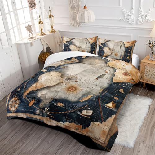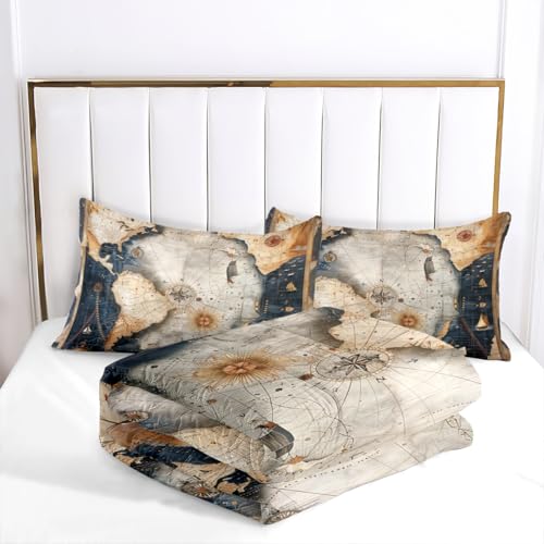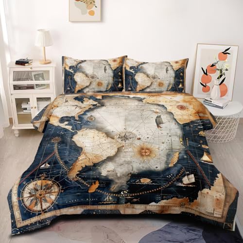 CCoutueChen Navigation Compass Comforter Set Queen, 3pcs World Map Soft Bedding Set for Women Girls, Lightweight Down Alternative Comforter with 2 Matching Pillowcases/Great Bedroom Decor (90" X 90")