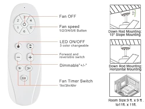 - Reversible 6-Speed Adjustable Fan: All operations can be controlled by the remote controller, adjust the fan speed with 6 levels and fan rotation direction, select light color temperature, and supports timing (1/3/6 hour) sleep shutdown, on/off. The fan and light can be turned on separately. (Tips: After fixed, the remote control can be used as a wall switch)