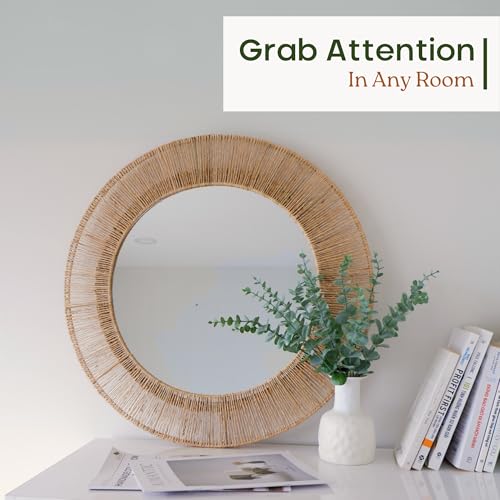 - β¨πππππππ ππππ πππππππππ β¨ Crafted from natural jute, this boho wall mirror brings an organic charm to your home decor, perfectly complementing your bohemian or coastal interior design. The rustic jute is tightly woven around a sturdy metal frame, ensuring durability that will last for years to come!