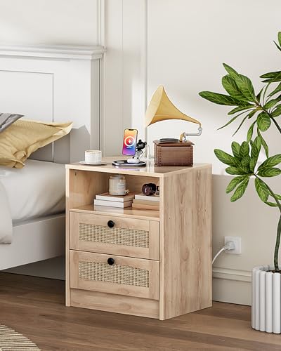 AILEEKISS Rattan Nightstand with Wireless Charging Station Modern Bedside Tables with Solid Wood Feet Rattan Night Stands End Table with Drawers and Open Storage Shelf for Bedroom (Natural)