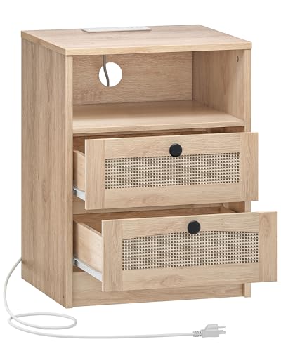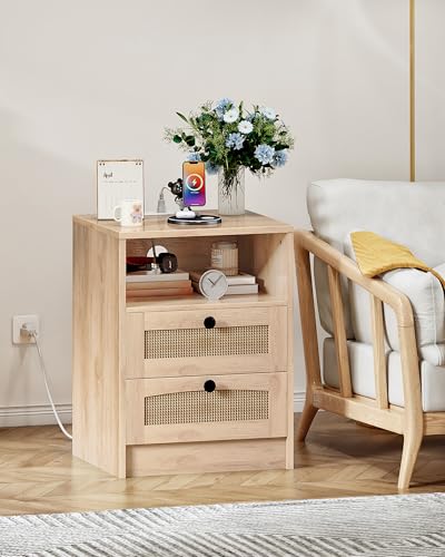 CHOEZON Rattan Nightstand, Boho Side Table, Bedside Table with Charging Station and 2 Drawers, Engineered Wood End Table, for Bedroom, Study, Natural MBZ07UNL