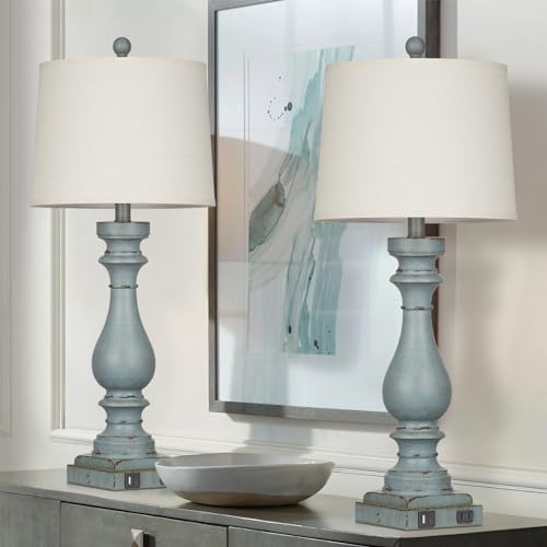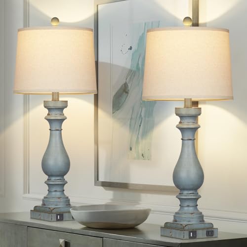 Cinkeda 29" Tall Table Lamp for Living Room Set of 2,Coastal Bedside Nightstand Lamps with USB C+A Ports & AC Outlet,3-Way Dimmable Touch Control Retro Blue Desk Lamp for Bedroom,Color 3
