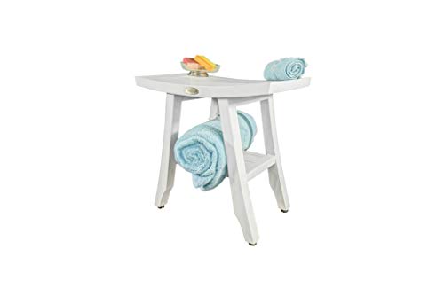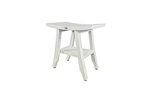 CoastalVogue Teak Satori Shower Bench Wooden Seat Spa Shower Stool with Curved Seat and Shelf Teak Wood Shower Bench in Antique White Finish – 18 inches Length x 12” Width