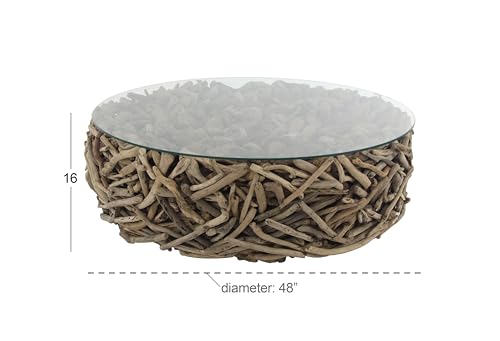 Deco 79 Driftwood Handmade Stacked Collage Coffee Table with Tempered Glass Top, 48" x 48" x 16", Brown
