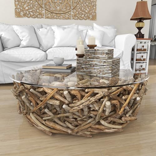 - ROUND HOME TABLE: This driftwood coffee table features a solid base for the spacious clear top