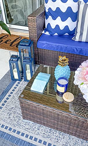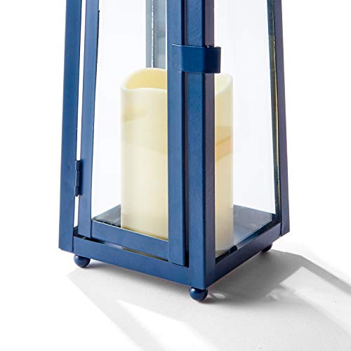 - REALISTIC CANDLE LANTERN: This decorative lantern features an elegant, navy blue metal frame with glass panels and a lifelike flameless candle inside. | Set of 2. | 4"W x 4"L x 11"H.