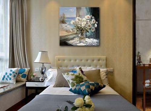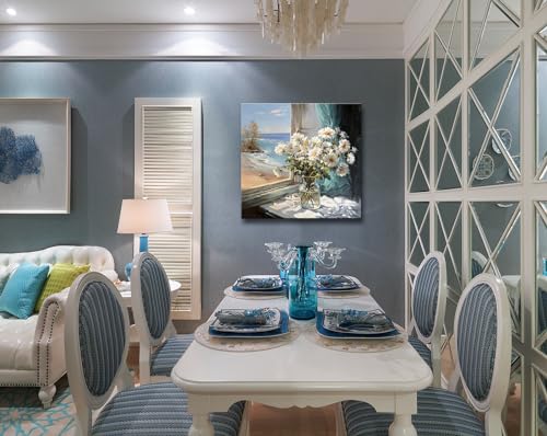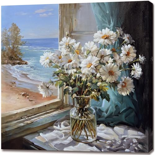 Bathroom Wall Decor White Flowers Canvas Wall Art Print Blue Beach Picture Ocean Modern Poster Coastal Seascape Painting Floral Daisy Artwork for Office Bedroom 14"x14"
