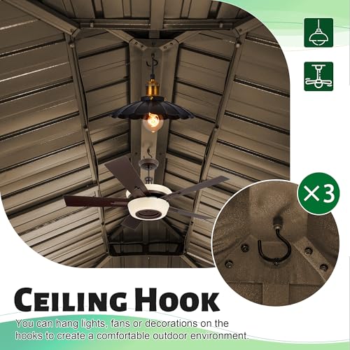 - Versatile Ceiling Hooks: Maximize the functionality of your hardtop gazebo with sturdy hooks! Each hook supports up to 20 lbs, making it easy to hang lights, fans, or decorative items. Effortlessly create the ideal outdoor ambiance for any occasion.