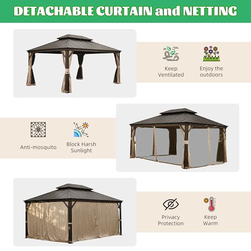 Domi 12x16FT Hardtop Gazebo, Outdoor Gazebo with Double Galvanized Steel Roof, Metal Pavilion Shelter for Patio, Lawn and Garden, Detachable Curtain and Netting Included, Brown