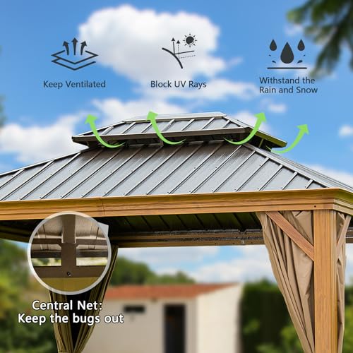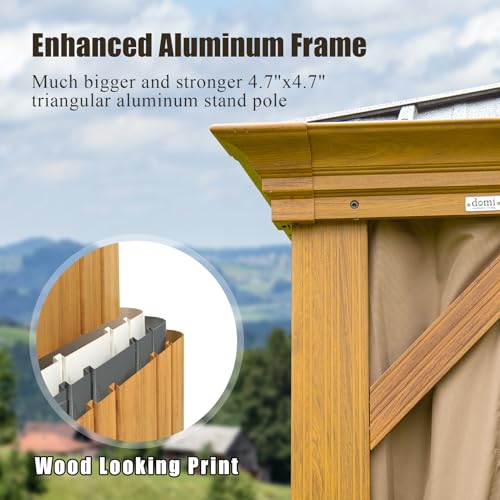 Domi Outdoor Living 10’x14’ Hardtop Gazebo, Wooden Coated Aluminum Frame Canopy with Galvanized Steel Double Roof, Outdoor Permanent Metal Pavilion with Curtains and Netting for Patio, Deck and Lawn