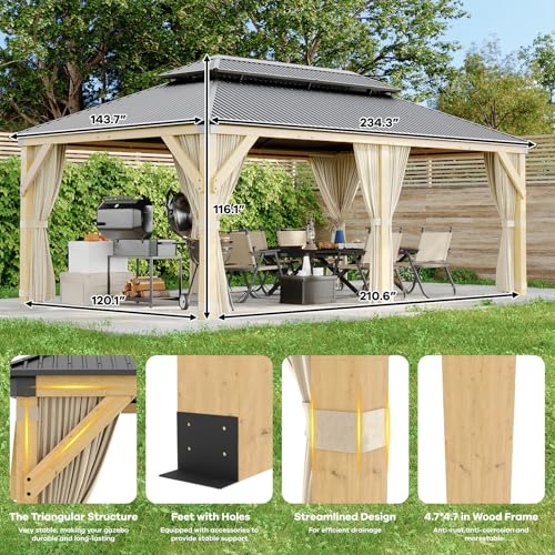 EliteEdge Hardtop Spruce Wood Gazebo 12'x20', with Double Roof of Metal Sheets, 4.7'' Heavy Duty Poles, Net, and Curtain, Permanent Building for Patio, Deck, Backyard, Lawn, and Garden-Khaki