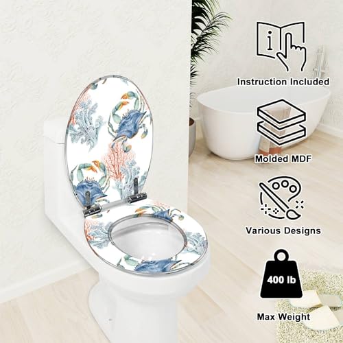 Elongated Toilet Seat sea blue crabs corals watercolor painted nautical style Resin Toilet Seat with Quietly Close Quick Release Hinges Decorative Toilet Seat with Cover Easy to Clean and Install