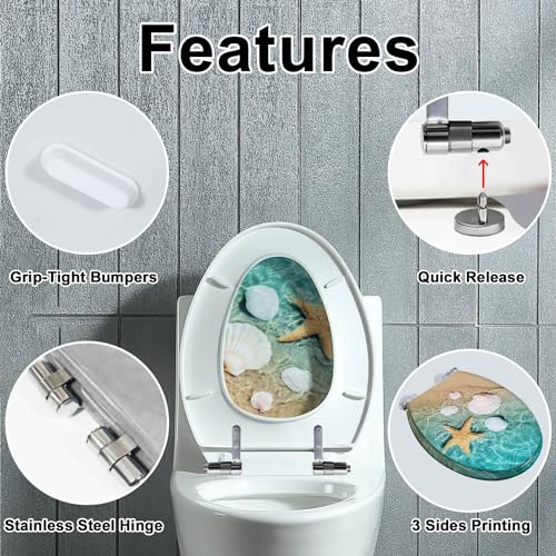 Elongated Toilet Seat seashell summer beach sea water Resin Toilet Seat with Quietly Close Quick Release Hinges Decorative Toilet Seat with Cover Easy to Clean and Install Beach Theme Decor