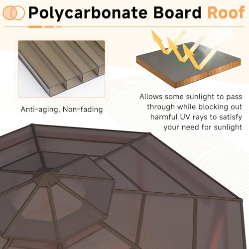 EROMMY 14.5' x 14.5' Gazebo, Outdoor Octagon Gazebo with Polycarbonate Double Roof, Wooden Finish Coated Aluminum Pavilion with Fence Rails and Ceiling Hooks for Garden, Patio, Lawn, Deck