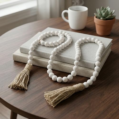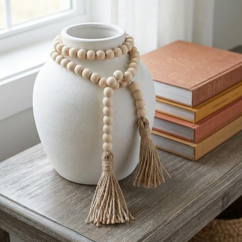 Farmhouse Beads 58in Wood Bead Boho Tassel Garland – Rustic Country Boho Chic Decor for Wall, Above Cabinet & Table