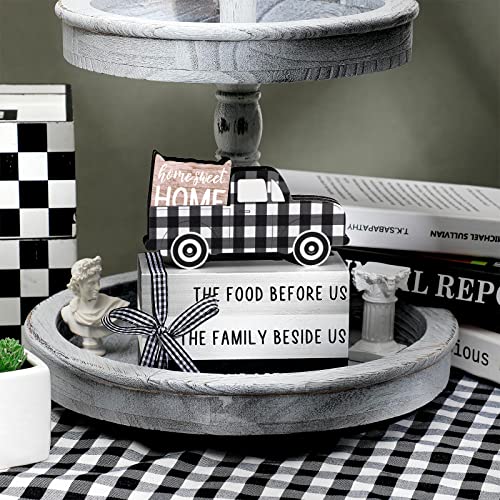 Jetec 4 Pcs Farmhouse Wooden Tabletop Decor Farmhouse Rustic Tiered Tray Decor Home Sweet Home Centerpiece Black and White Truck Buffalo Plaid Tabletop Sign for Kitchen Shelf Desk Decoration