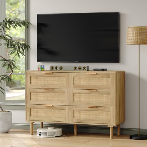 Furniouse 6 Drawer Rattan Dresser for Bedroom, Wooden Dresser Chest of Drawers, Storage Organizer for Closet, Beside Table for Living Room, Entryway