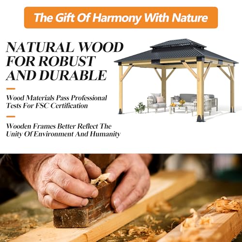 - 🏡PREMIUM QUALITY WOOD FRAME: Our outdoor wooden gazebos are built with high-quality wood frames that are FSC certified to ensure the patio vented roof gazebo durability and stability. Made from robust wood that is long-lasting, providing you with a durable outdoor deck wood gazebo. Additionally, we uphold the ecological balance and biodiversity of our forests by adhering to FSC standards. And promoting ecologically sustainable development in crafting this wood frame gazebo.