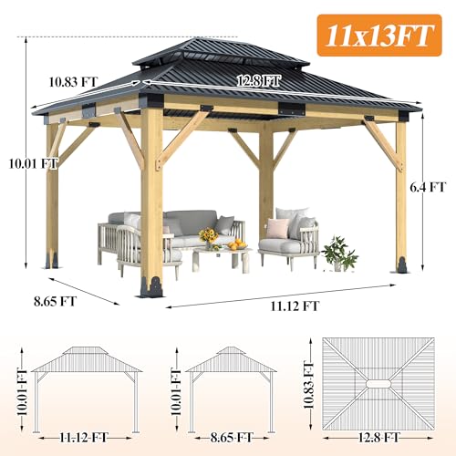 - 🏡VENTED DOUBLE-TOP DESIGN: Our hardtop wooden frame gazebos feature a double-top design that allows for optimal air circulation to keep you cool and comfortable on hot summer days. On rainy days, double-topped vertical stripes ensure easy rainwater run-off, and the wood gazebo’s effective system also helps relieve pressure on the galvanized steel gazebo top, ensuring a safe and secure outdoor space.