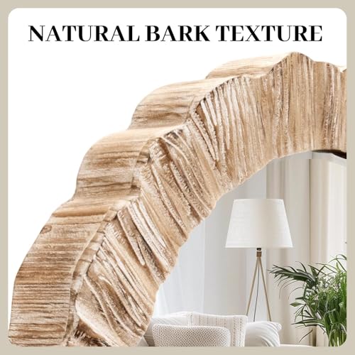 - WALL DECOR: Tired of staring at that pesky blank space on your wall in the living room or bedroom? Rustic and chic, our round wood round wall mirror opens up your space with on-trend shapes and a choice of finishes to reflect your style. The bark finish surround the gleaming mirror, with a noticeable deep texture, creating a stunning wall accent.