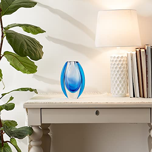 - [PERFECT VASE DECOR]: Accentuate your tabletop in your home or office with this exquisite decorative vase! Great to add to your collection of vases for décor or glass vases for flowers. Set it next to your window to capture the sunlit cool blues and clear glass that dance together in this stunning art glass vase. Individually hand-crafted for its unique beauty and therefore may be slightly different from the picture shown.
